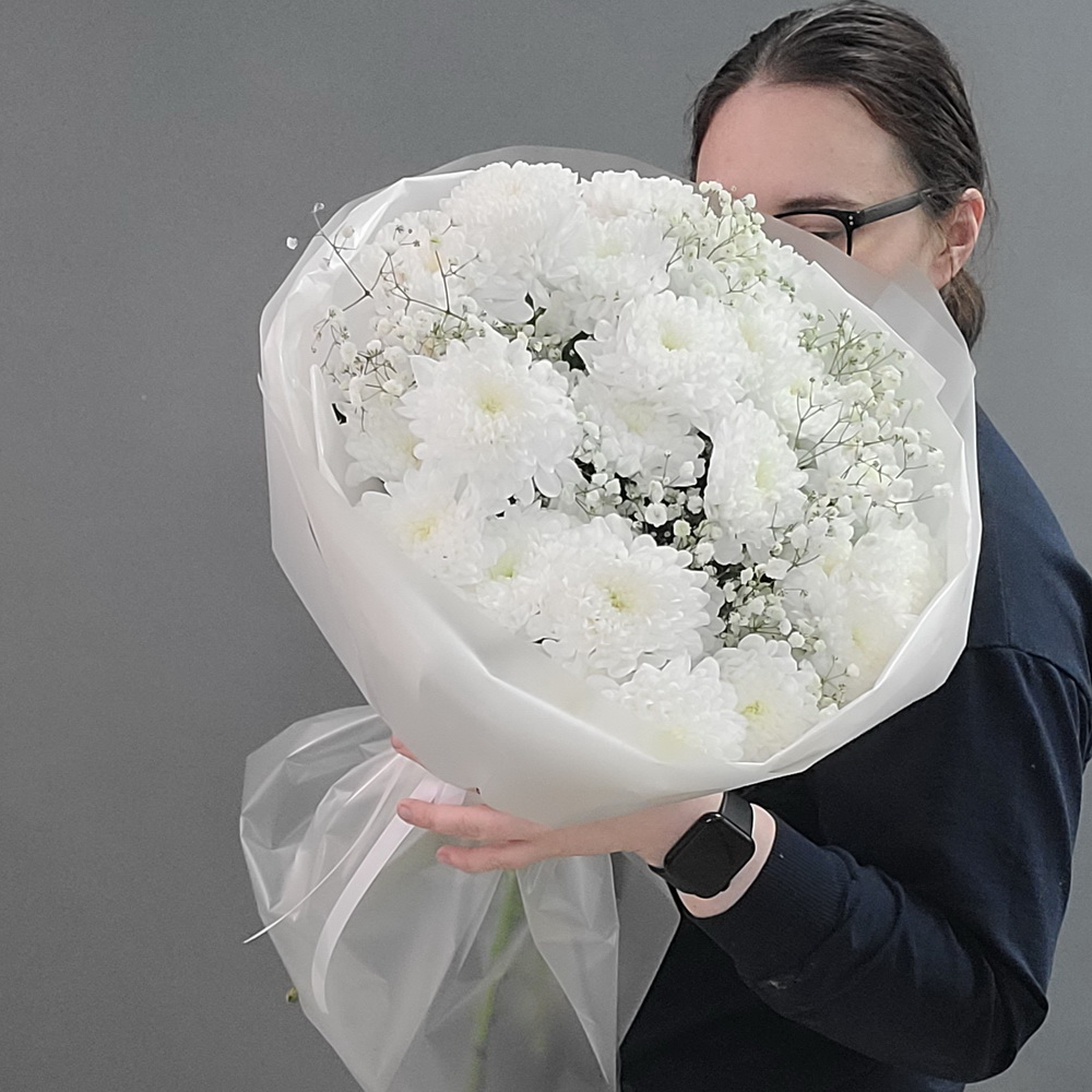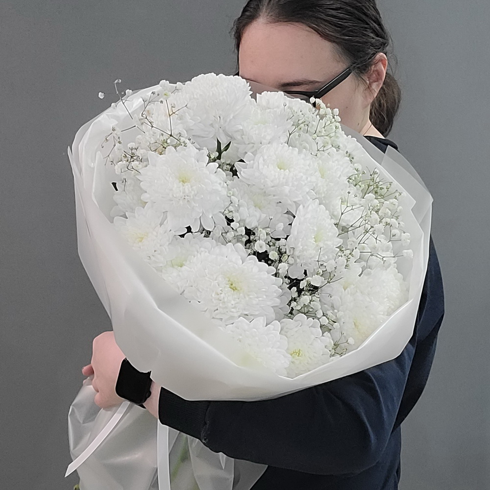 Букет из семи белых хризантем с добавлением белой гипсофилы, в упаковке из плёнки матовой белого или кремового цвета. Нежный, необычайно стойкий букет.