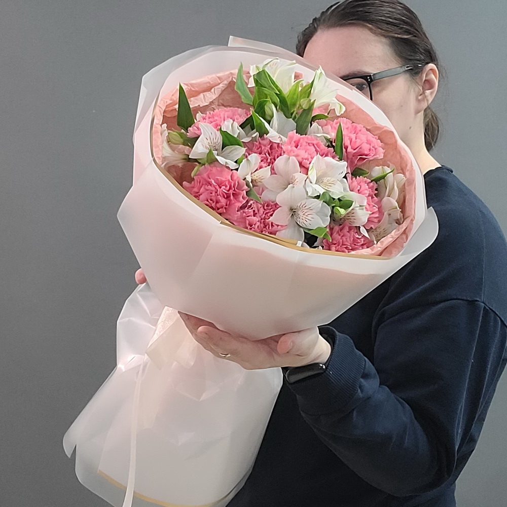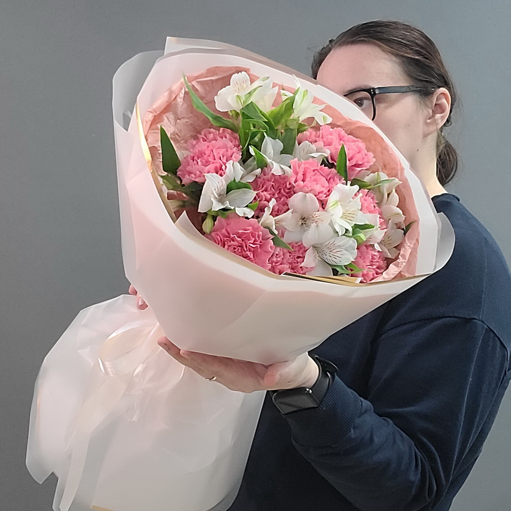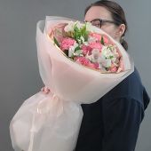 Нежный и ароматный букет из 15 диантусов и эвкалипта в упаковке в тон букету.