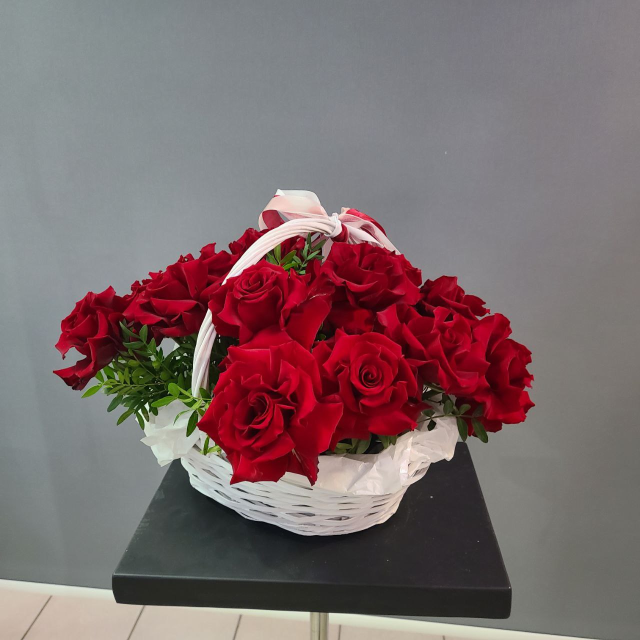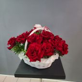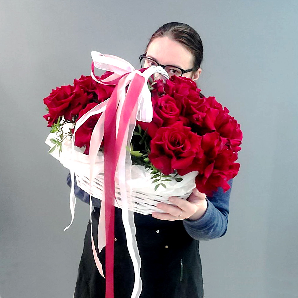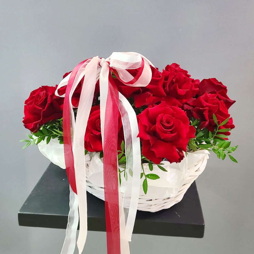 Композиция из 15 роз в корзине с добавлением флористической зелени. Не требует замены воды и полива.