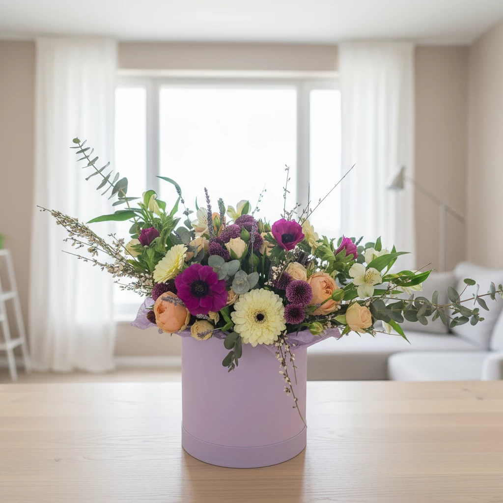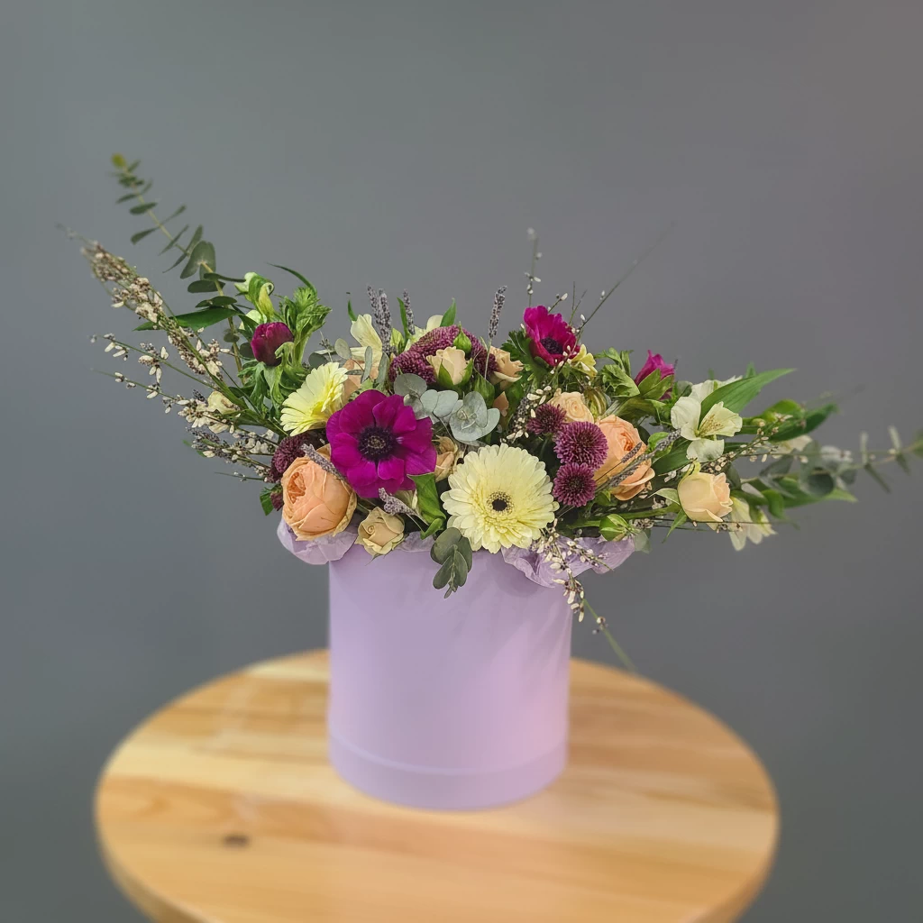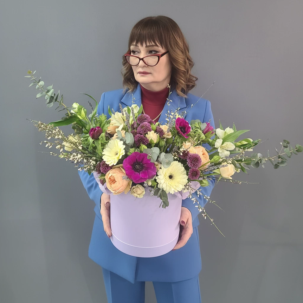 Шляпную коробку подобрали близко к оттенку анемона, но не точно в тон — чтобы она не отвлекала внимание от букета. При этом следили, чтобы анемон не выбивался из общей массы, но и не терялся в ней.