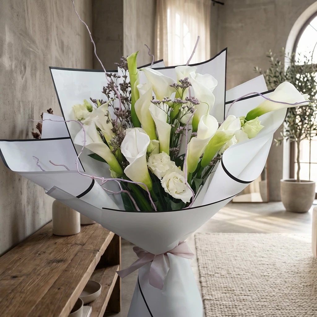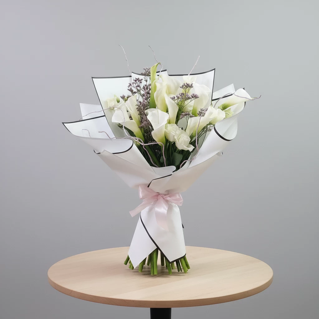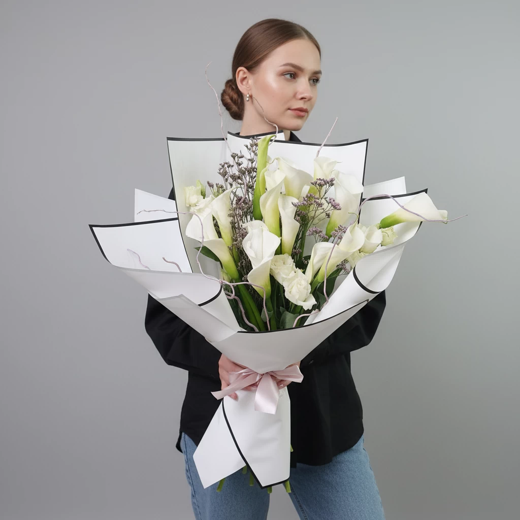 Белые каллы в обрамлении белой эустомы, воздушного лимониума и ветвей корилуса. Лаконичная упаковка подчёркивает благородство — без лишнего, но с лёгкой игривой ноткой.