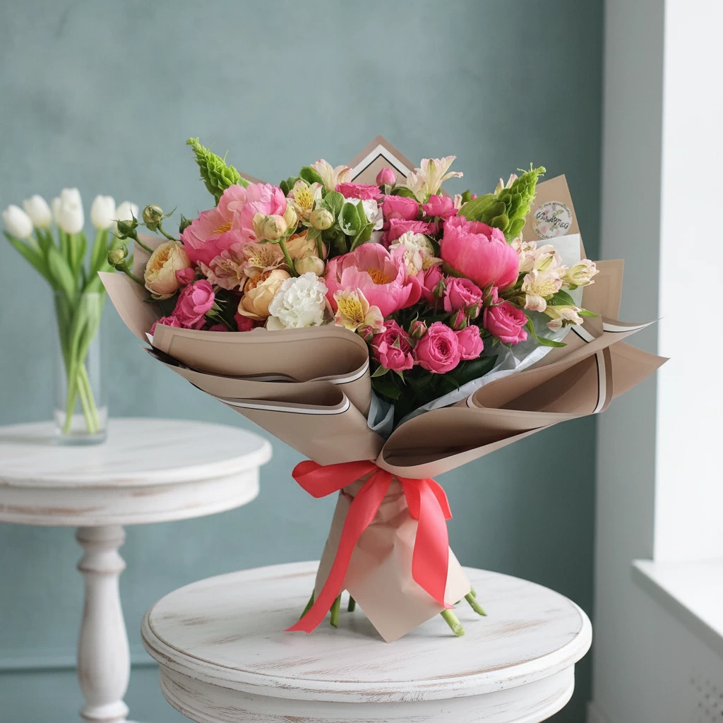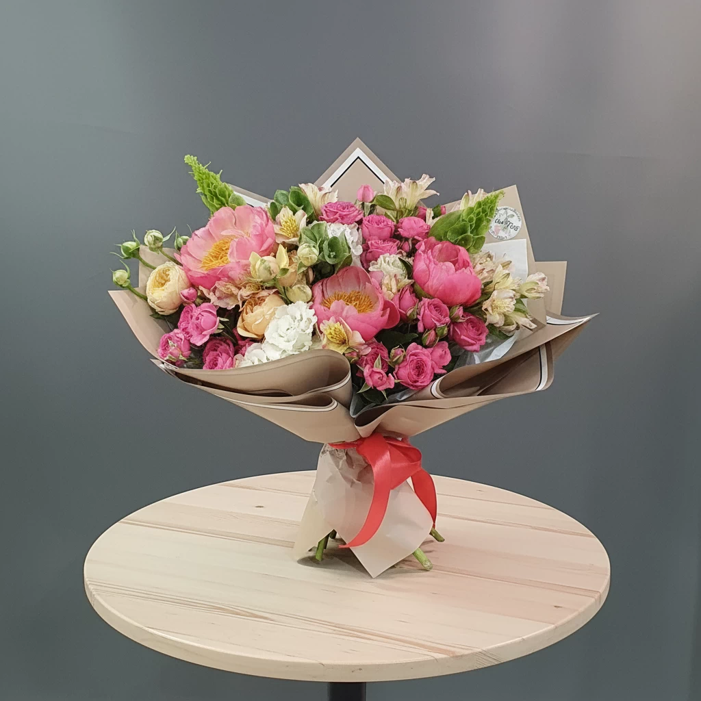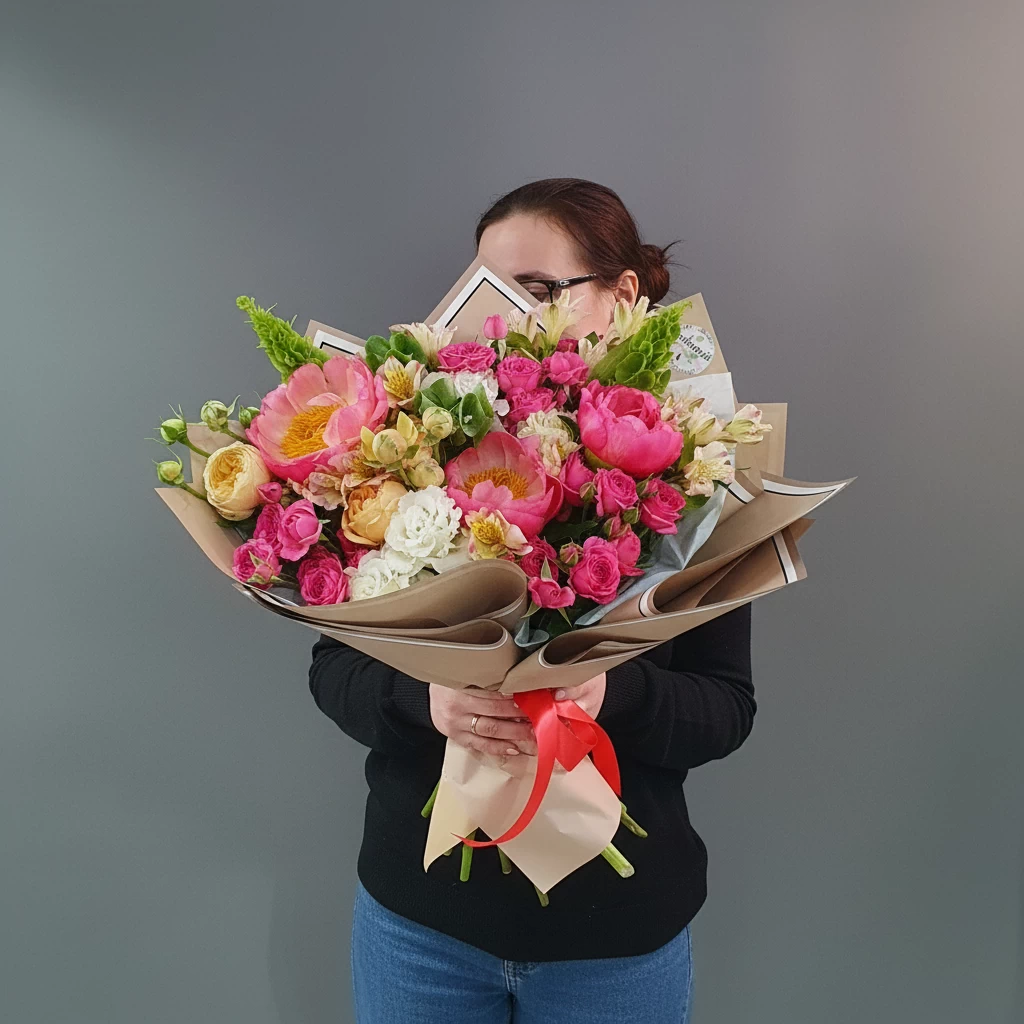 В этом букете прекрасно всё: крупные пионы, необычная молюцелла (зелёные цветы, похожие на коралл), пионовидные и кустовые розы, альстромерия, эустома. Лучшие цветы лета.