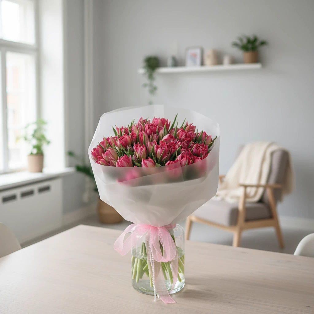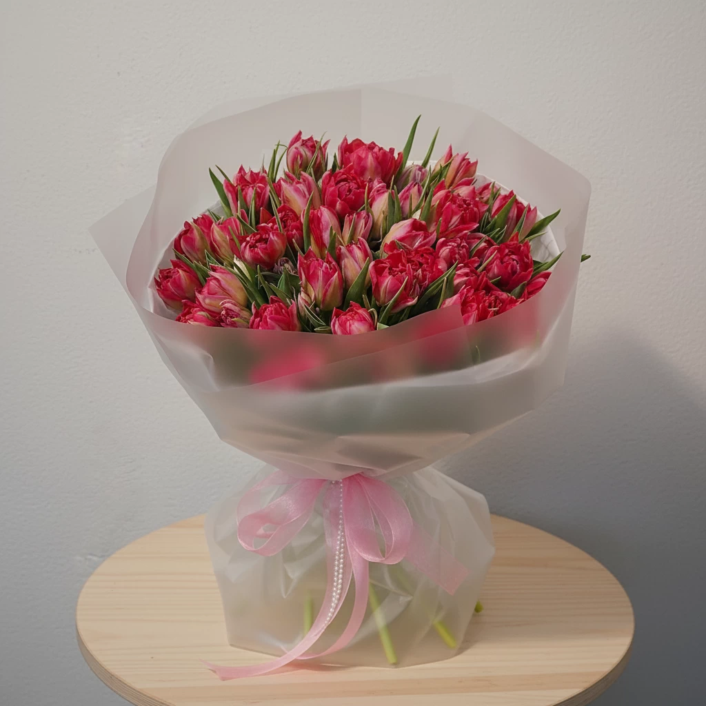 Этот заказ мы получили к 8 Марта. Главные герои — пионовидные тюльпаны. Их 45. Сортовые, крупные, с плотными махровыми бутонами, которые больше похожи на пионы, чем на привычные тюльпаны. В каждом из них — ощущение наступившей весны.