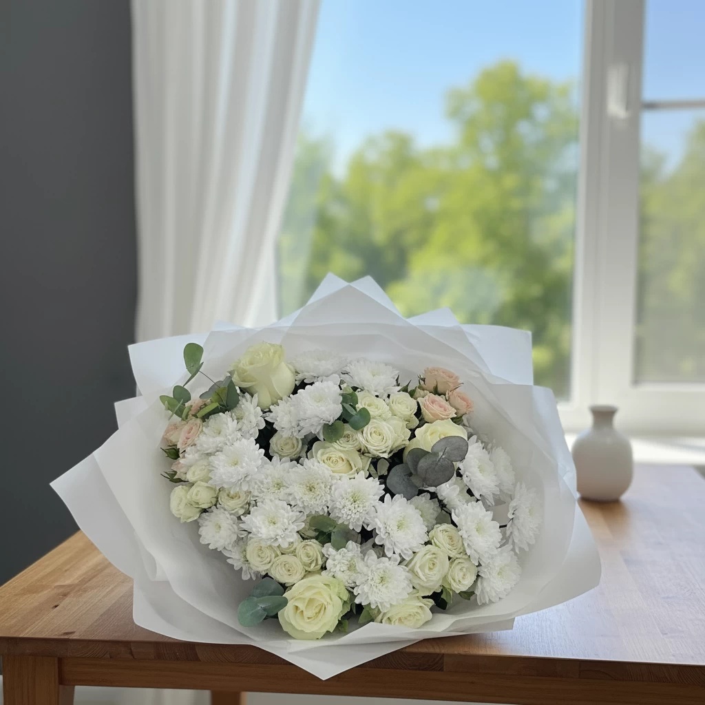 Букет выдержан в единой цветовой гамме с мягкой игрой полутонов, что придаёт ему фактуру и объём. За счёт неравномерного распределения цветов такую композицию интересно рассматривать с разных сторон — она не выглядит плоской.