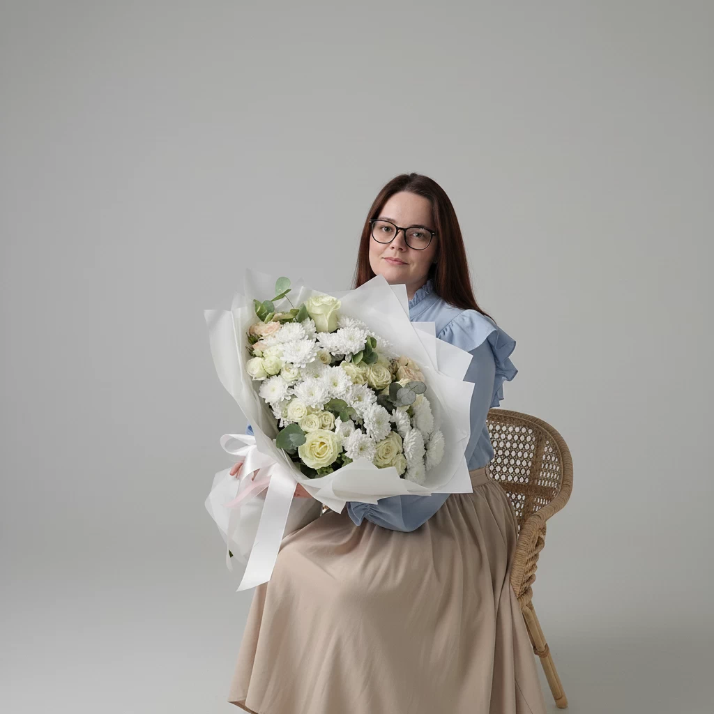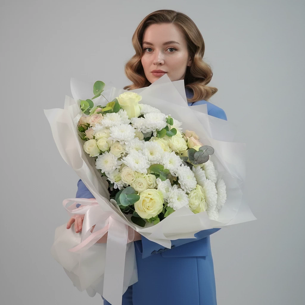 Основой стала кустовая белая хризантема «Алтай» — на данный момент мы работаем именно с этим сортом. Она ценится за ажурную текстуру, нежность, объёмные кусты и отличную стойкость. В композицию добавили кустовую розу двух оттенков (белую и кремовую) в двух формах: стандартной и пионовидной. Акцентными цветами стали одноголовые белые розы «Мондиаль».