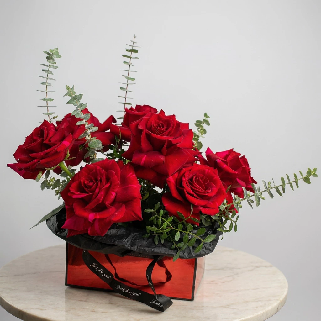 Нашумевшие королевские розы в элегантной коробке-сумочке — это не просто цветы, это модный аксессуар. Композиция «Леди в красном» создана для тех, кто ценит стиль, статус и безупречный вкус. Благородные бордовые розы, свежий эвкалипт и изящная флористическая зелень — в упаковке, которая сама привлекает внимание. А главное — вы выбираете, в чём будет жить эта красота.