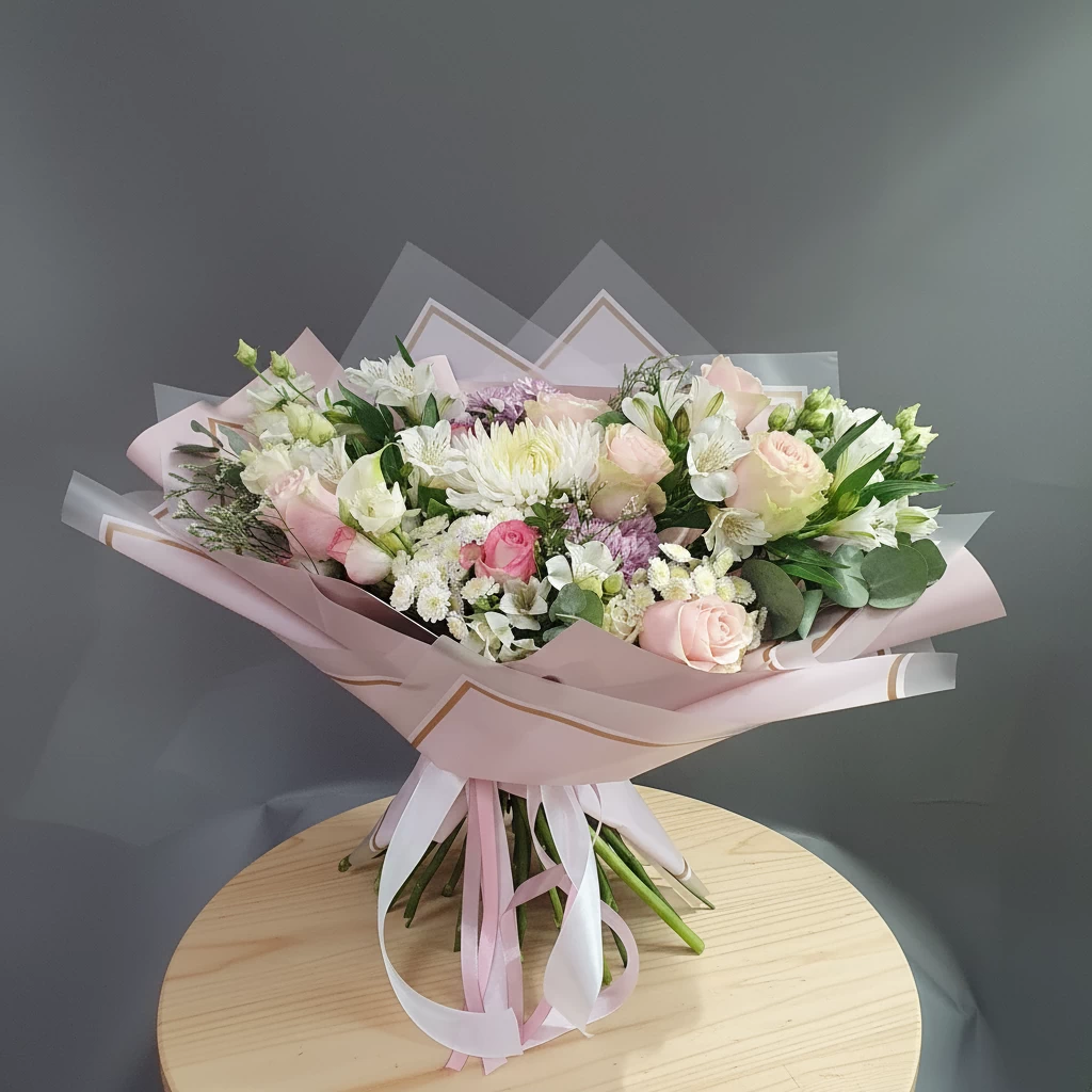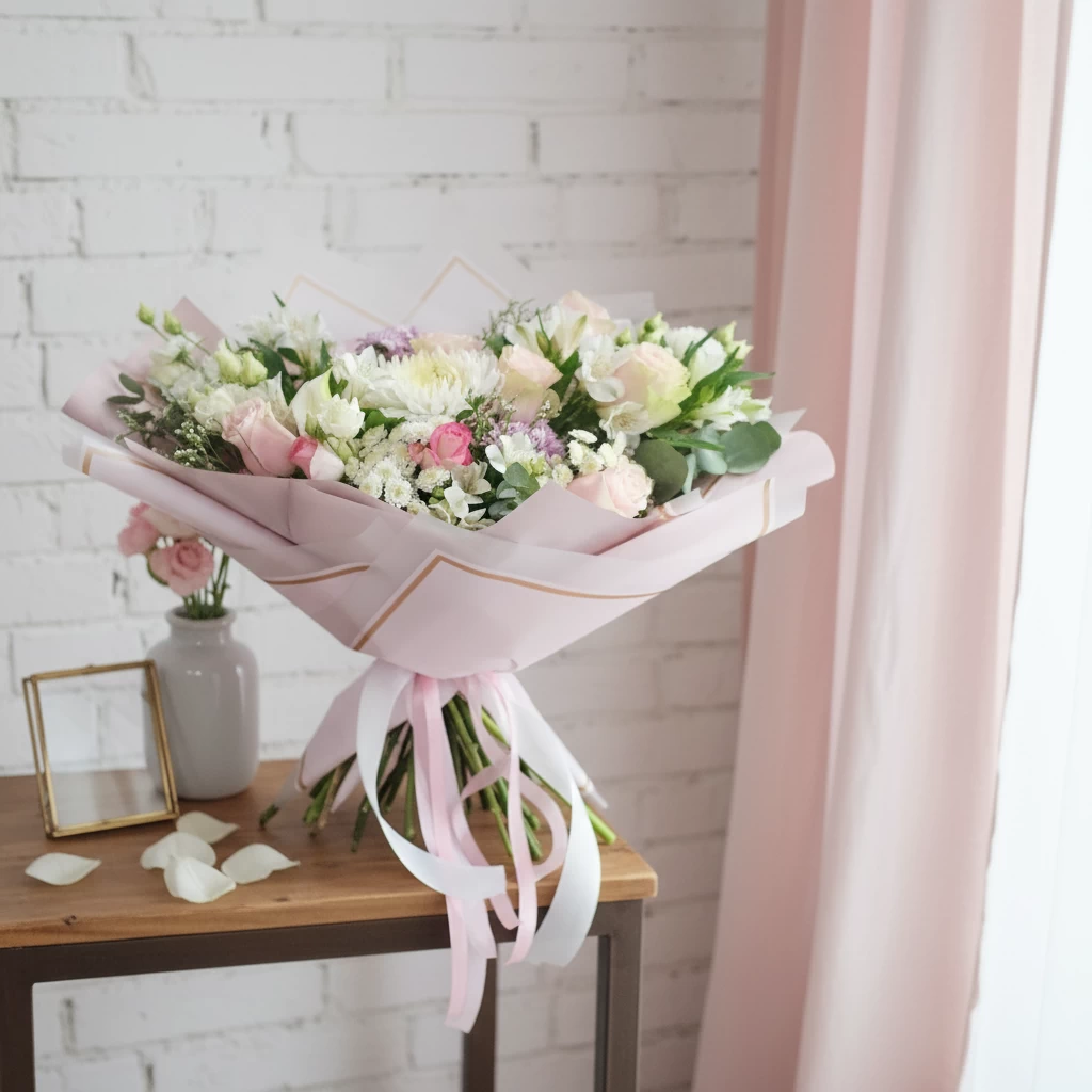 Хризантема — один из самых стойких цветов. К ней мы добавили альстромерию — рекордсмена по длительности пребывания в вазе. Форму букета вытянули с помощью розовой эустомы и эвкалипта, а её колокольчики подарили композиции лёгкость и воздушность.