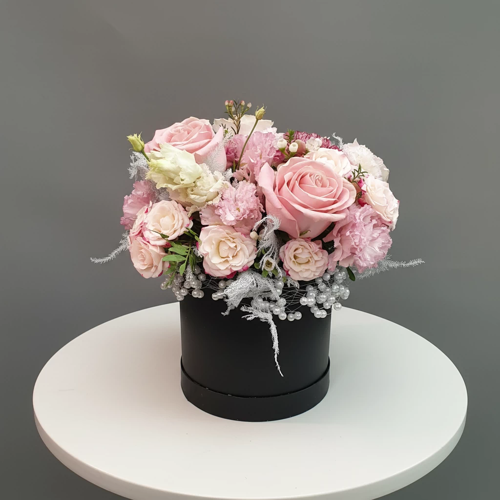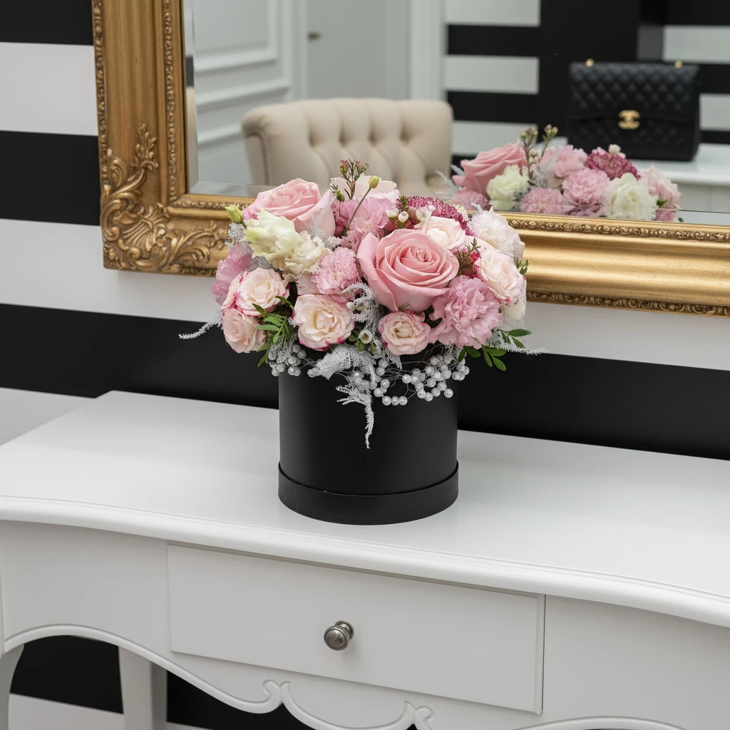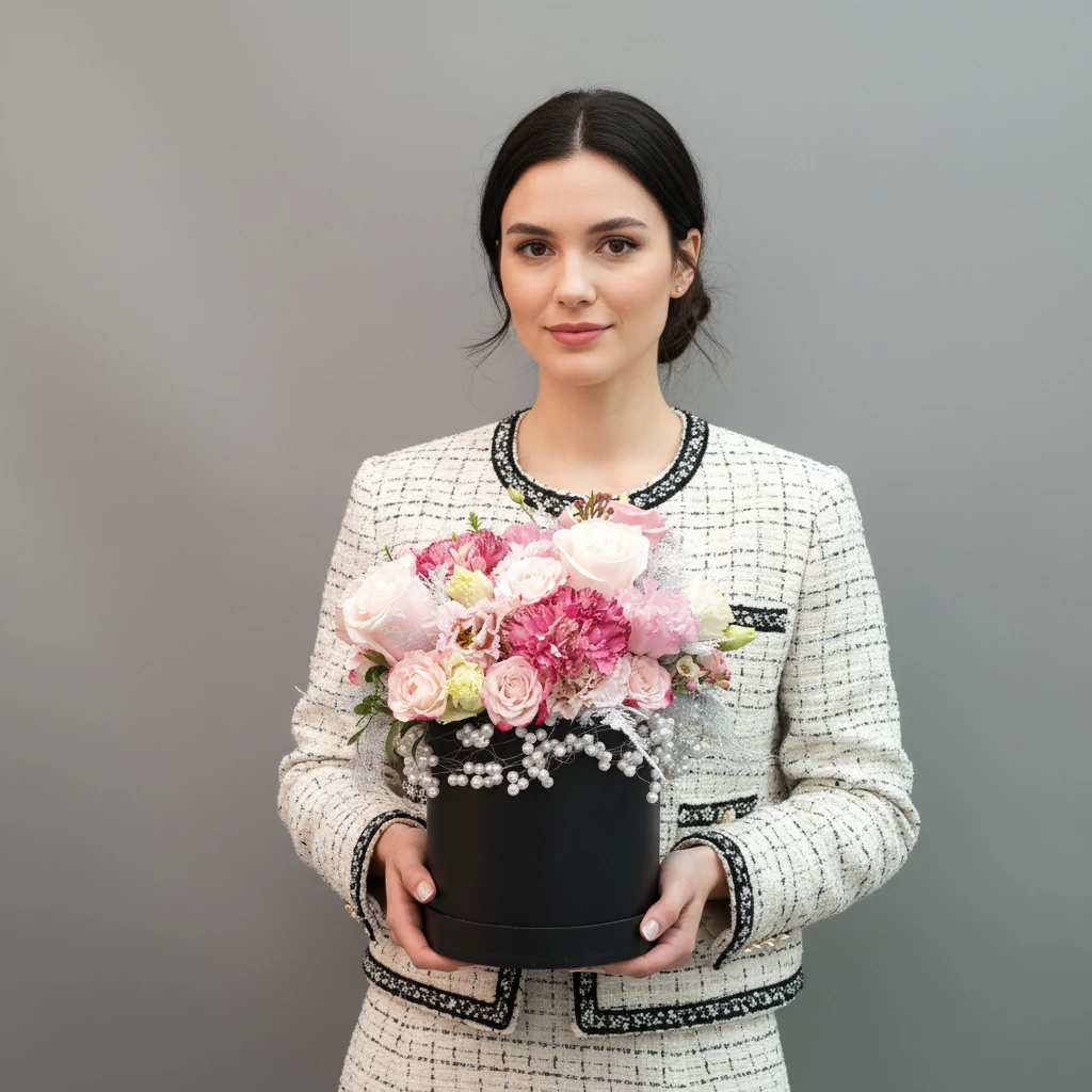 Композиция выполнена на заказ для именинницы — вечеринка проходила в стиле Шанель. Безусловно, референсом стало маленькое чёрное платье: это отразилось в цвете шляпной коробки. Нить жемчуга также обыграна в декоративном плетении из бусин.